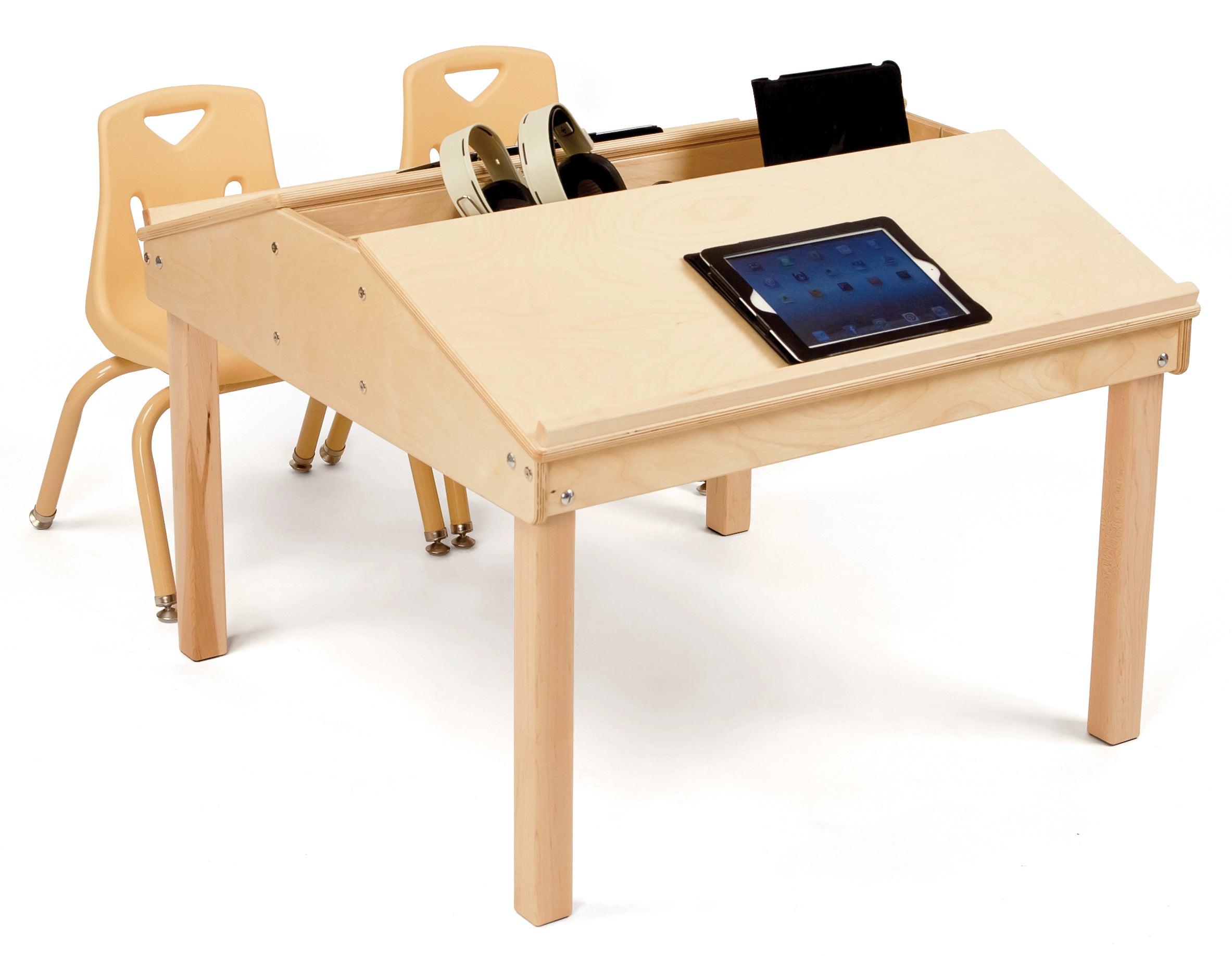 Encourage quiet reading time and proper posture with the Quad Tablet and Reading Table. The ergonomically correct angle is great for tablets, while the built in storage is perfect for books, chargers, and other peripherals. 33" W x 33" D x 20 1/2" H.
