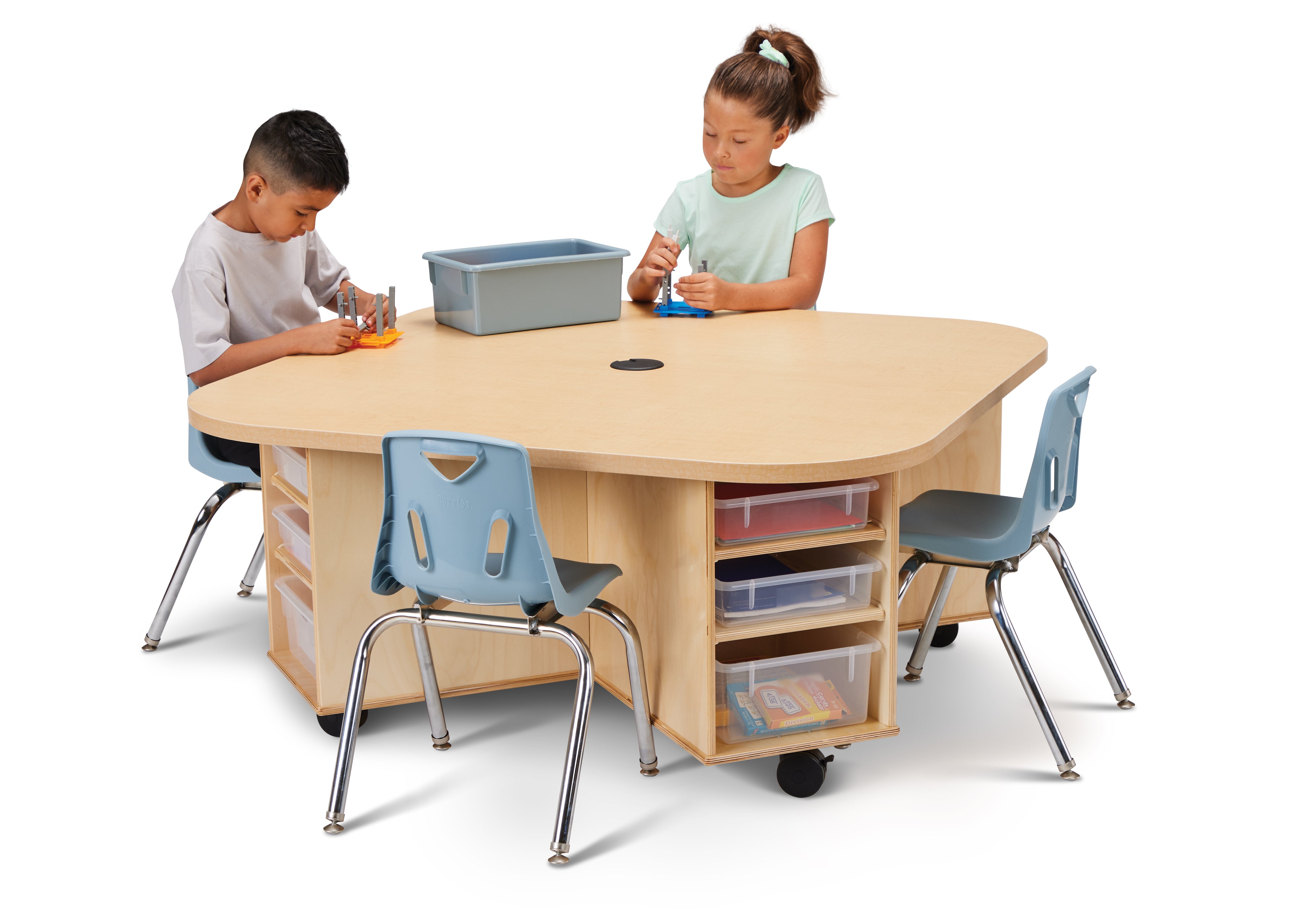 Keep makerspaces organized and functional with the Innovate STEAM Table. This four-station table features tray organizers at each station to keep materials and resources within an arm’s reach. Each tray organizer boasts two clear paper trays and one clear tub for ample storage. Heavy-duty, 3” locking casters allow for quick and easy movement. The maple laminate top with maple TRUEdge creates a seamless, natural look while providing durability. A top grommet keeps cords organized and allows them to pass through to a floor or wall outlet. The optional 6282JC Power Outlet Kit (sold separately) replaces the grommet and add two 120V outlets and two USB-A charging ports to keep devices powered up for exploration. Overall dimensions are 48” W x 48” D x 22.5” H. Recommended for use with 14” chairs or stools.