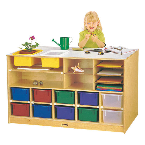Two cubbie tray cutouts and trays with lids allow tabletop art projects, experiments, or storage. One side features ten clear cubbie trays and shelves. Seven shelves and four clear tubs are on the other side. Caster mounted. 48 1/2" wide x 29" deep x 29" high.