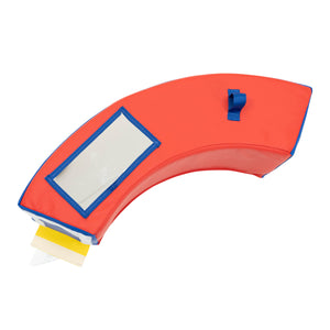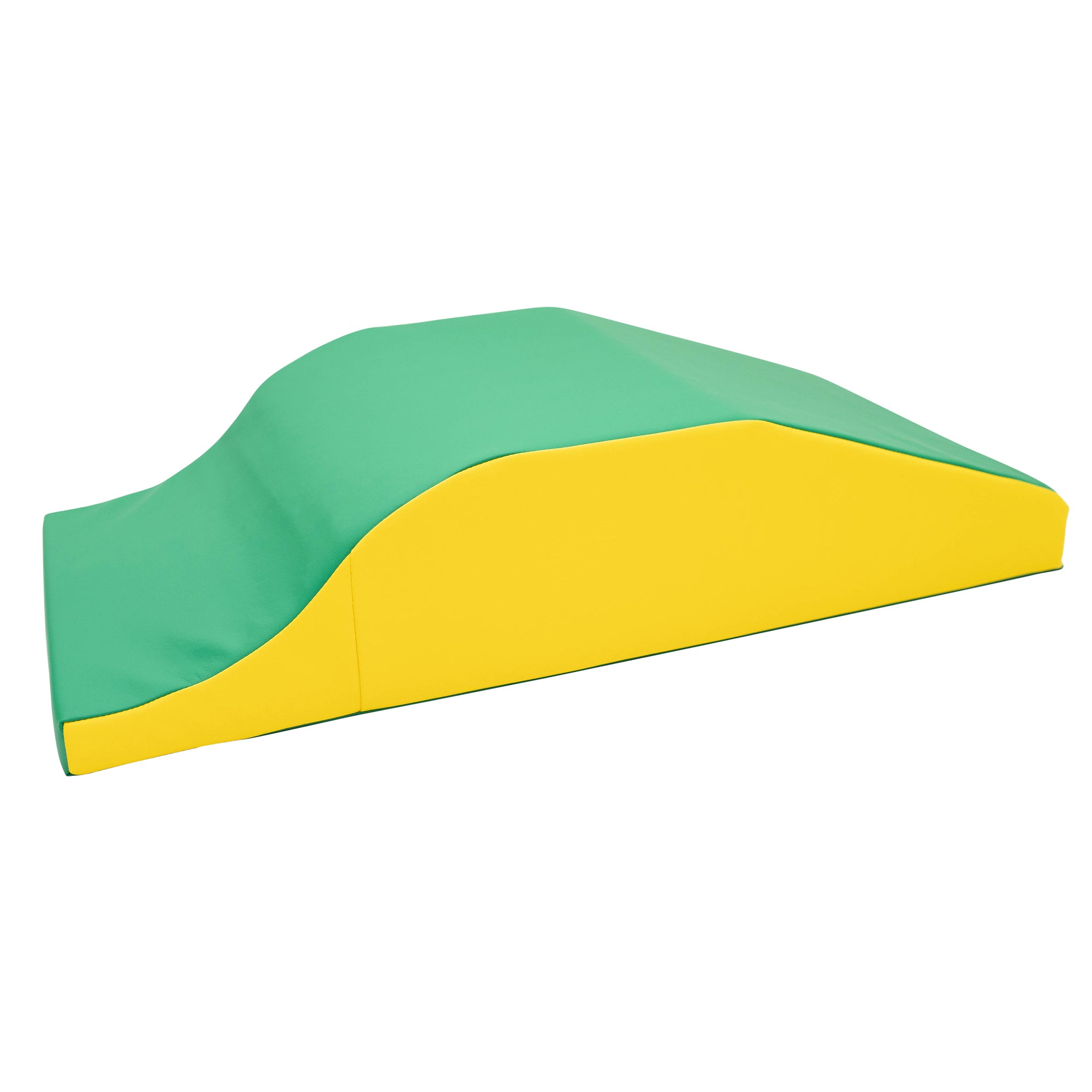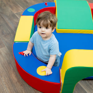 Softly safe interactive crawly haven for active little people. Nine separate child formed shapes fasten together in a softscape play area for crawlies thru small 3's. 8" h sides aid in pull ups, sit downs, or enfolding babies. Squeakers, bell, and mirror, plus loops for add ons to stimulate learning and fine motor exploration. Drop in 1" thick foam floor covered in wipe clean vinyl.