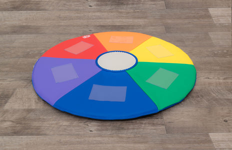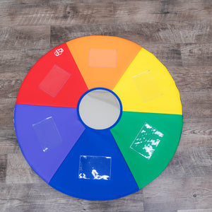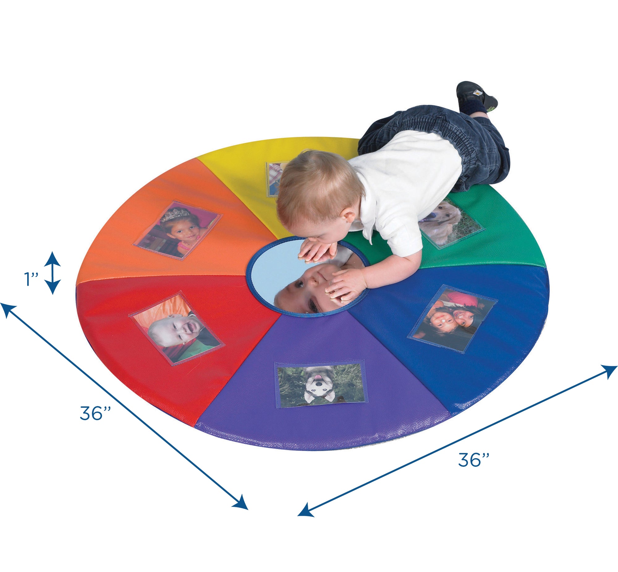 Rainbow-colored mat made of durable 14 oz vinyl. A wonderful mat for tummy time! Insert six pictures in the clear 4" x 6" pockets to add new interest. Center flexible mirror attracts inquisitive baby to look in and see me!