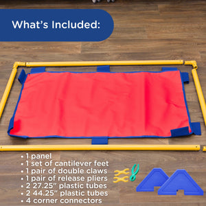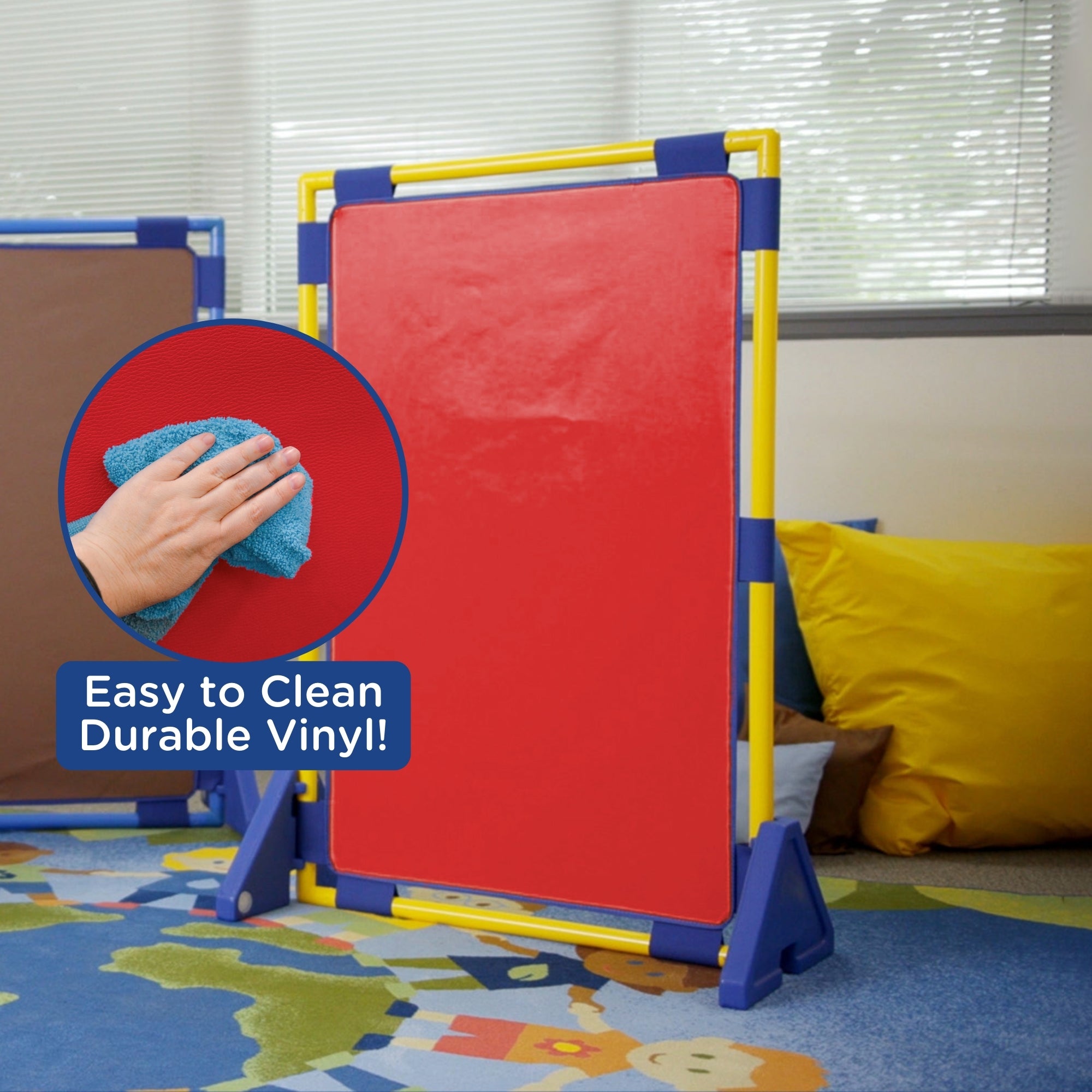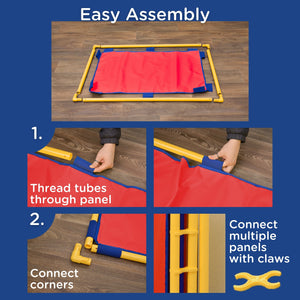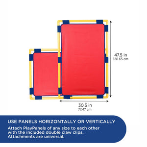 Customize your kids' learning space with the PlayPanel Room Dividers. Room dividing panels serve a variety of purposes such as separating activities or creating different work stations in your classroom. Using dividers encourages children to focus on the lesson or activity at hand without distractions. Each panel easily attaches to another with double claw clips. One set of double claw clips included. The easy to clean vinyl surface is stretched over durable, plastic, pipe frame. Weighted, cantilever legs connect to our PlayPanels to make them free-standing, stable room partitions. One pair of PlayPanel legs included.