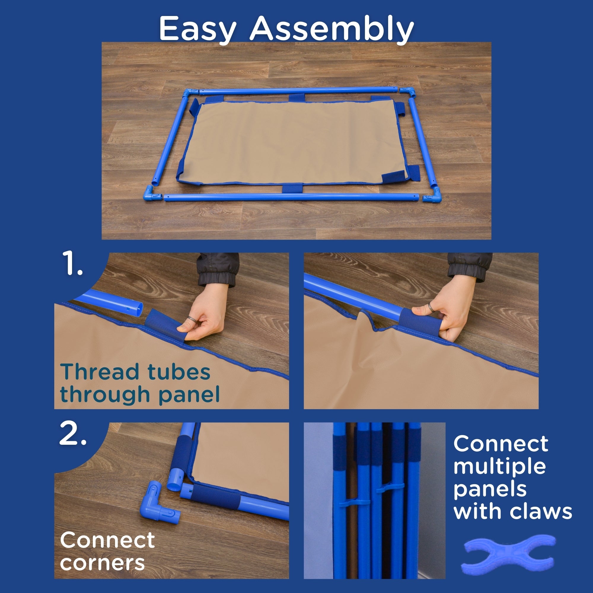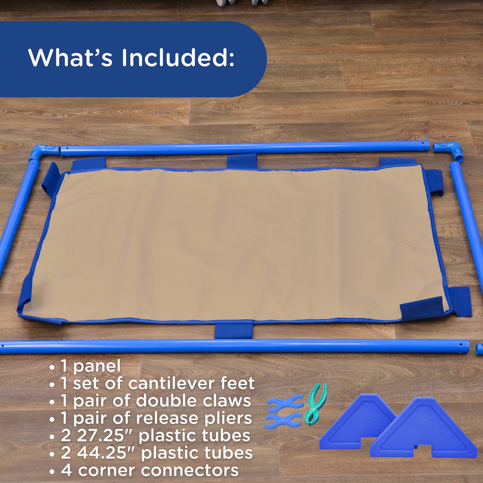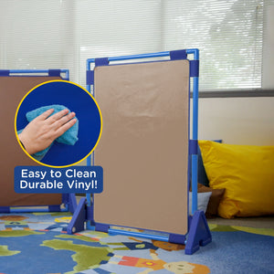 Customize your kids' learning space with the PlayPanel Room Dividers. Room dividing panels serve a variety of purposes such as separating activities or creating different work stations in your classroom. Using dividers encourages children to focus on the lesson or activity at hand without distractions. Each panel easily attaches to another with double claw clips. One set of double claw clips included. The easy to clean vinyl surface is stretched over durable, plastic, pipe frame. Weighted, cantilever legs connect to our PlayPanels to make them free-standing, stable room partitions. One pair of PlayPanel legs included.