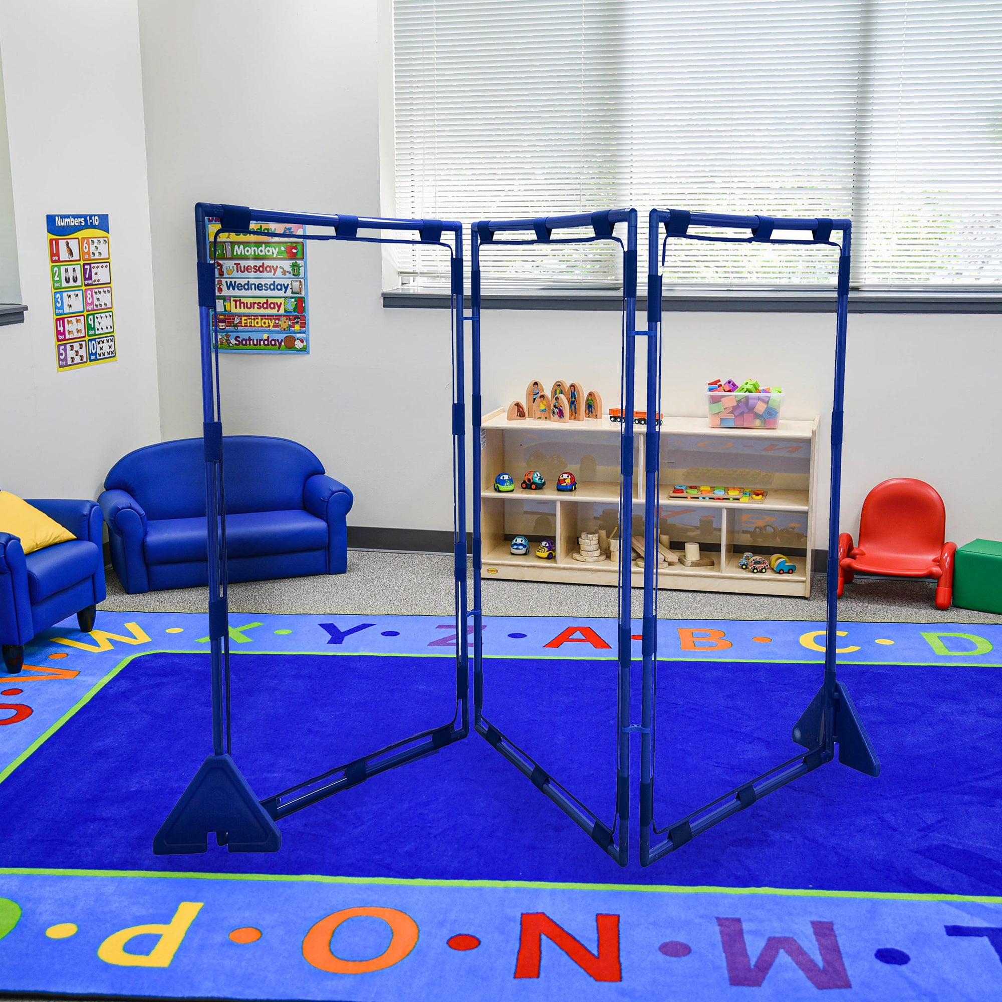 Customize your kids' learning space with the PlayPanel Room Dividers. Room dividing panels serve a variety of purposes such as separating activities or creating different work stations in your classroom. Using dividers encourages children to focus on the lesson or activity at hand without distractions. Each panel easily attaches to another with double claw clips. Three sets of double claw clips included. The easy to clean vinyl surface is stretched over durable, plastic, pipe frame. Weighted, cantilever legs connect to our PlayPanels to make them free-standing, stable room partitions. One pair of PlayPanel legs included.