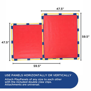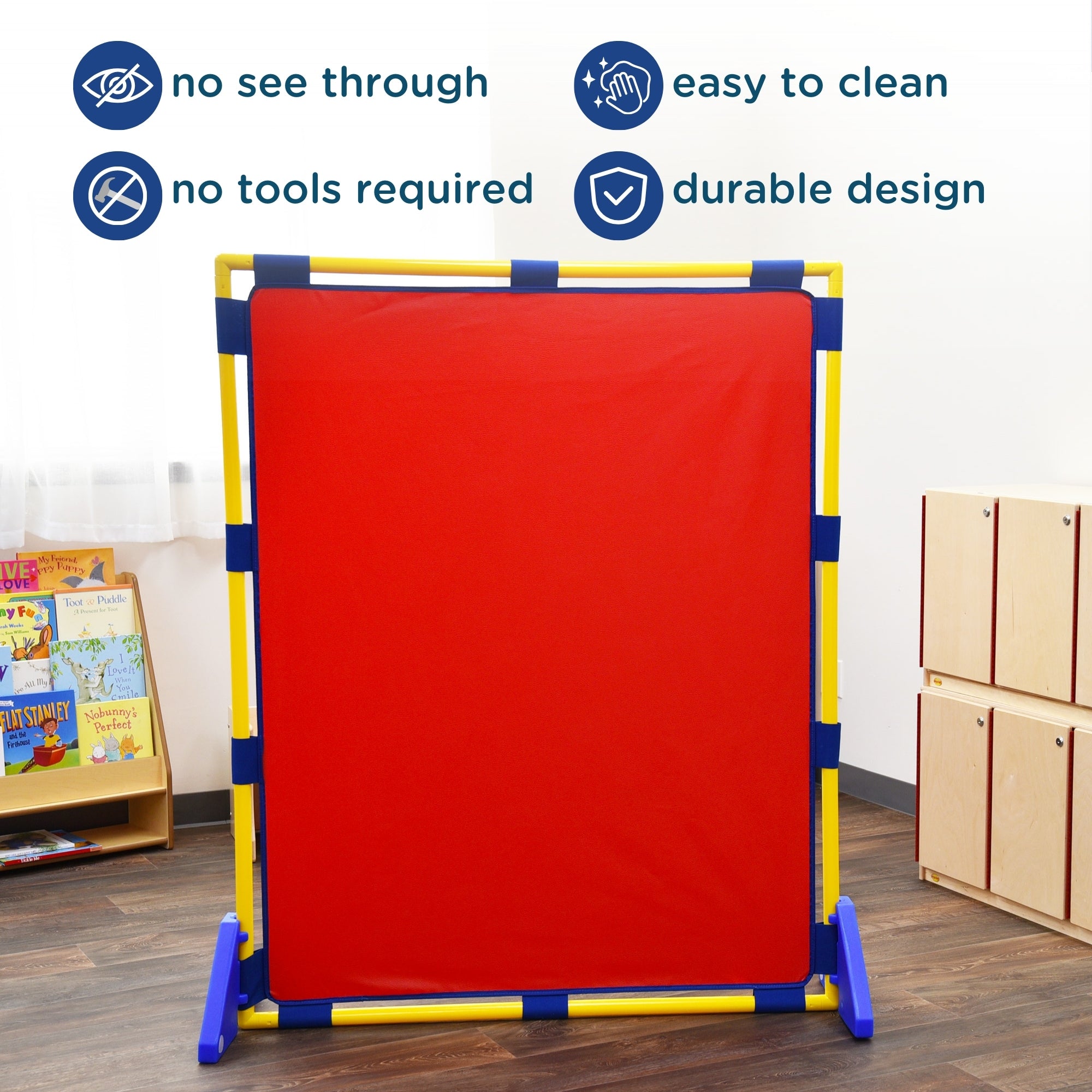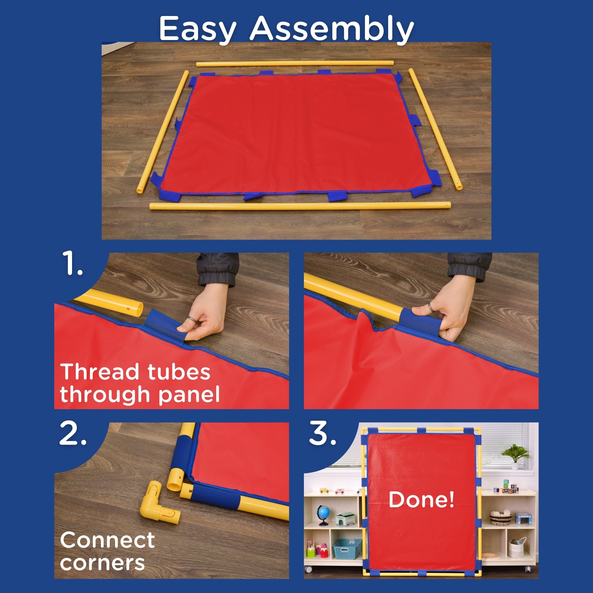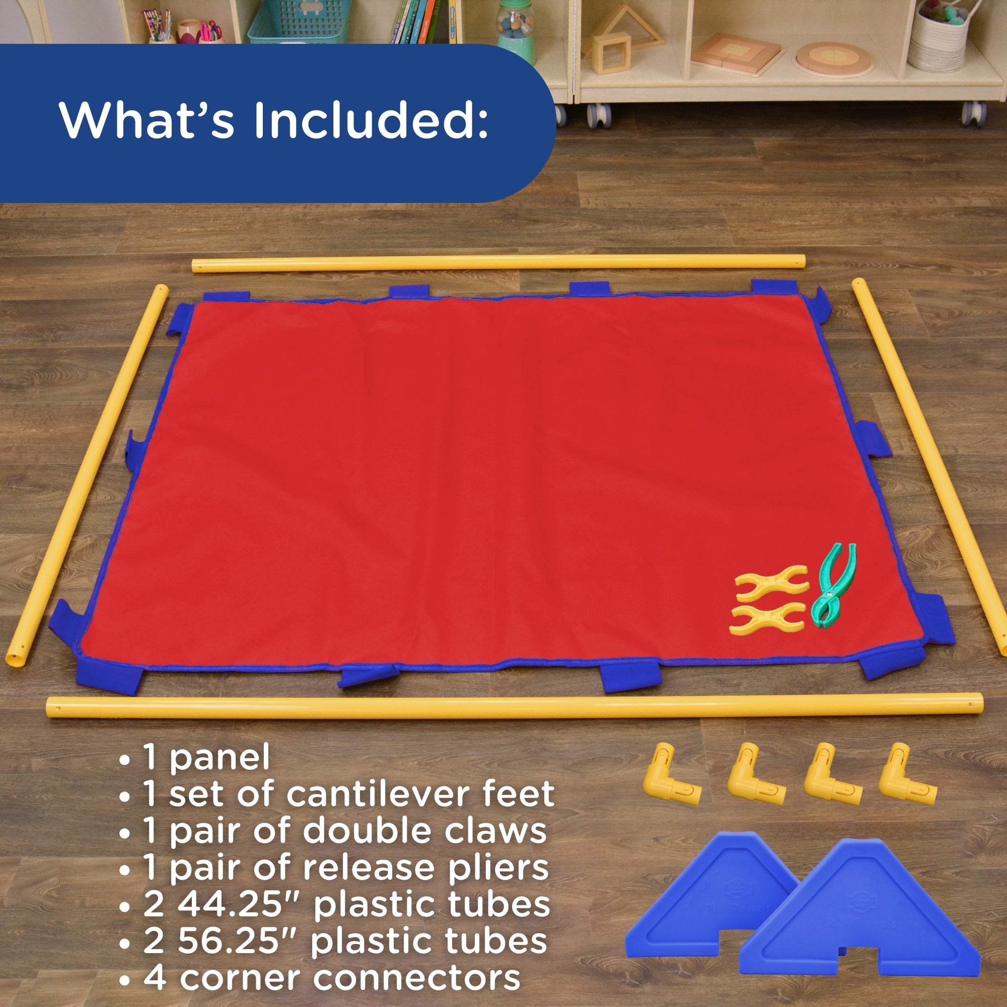 Customize your kids' learning space with the PlayPanel Room Dividers. Room dividing panels serve a variety of purposes such as separating activities or creating different work stations in your classroom. Using dividers encourages children to focus on the lesson or activity at hand without distractions. Each panel easily attaches to another with double claw clips. One set of double claw clips included. The easy to clean vinyl surface is stretched over durable, plastic, pipe frame. Weighted, cantilever legs connect to our PlayPanels to make them free-standing, stable room partitions. One pair of PlayPanel legs included.