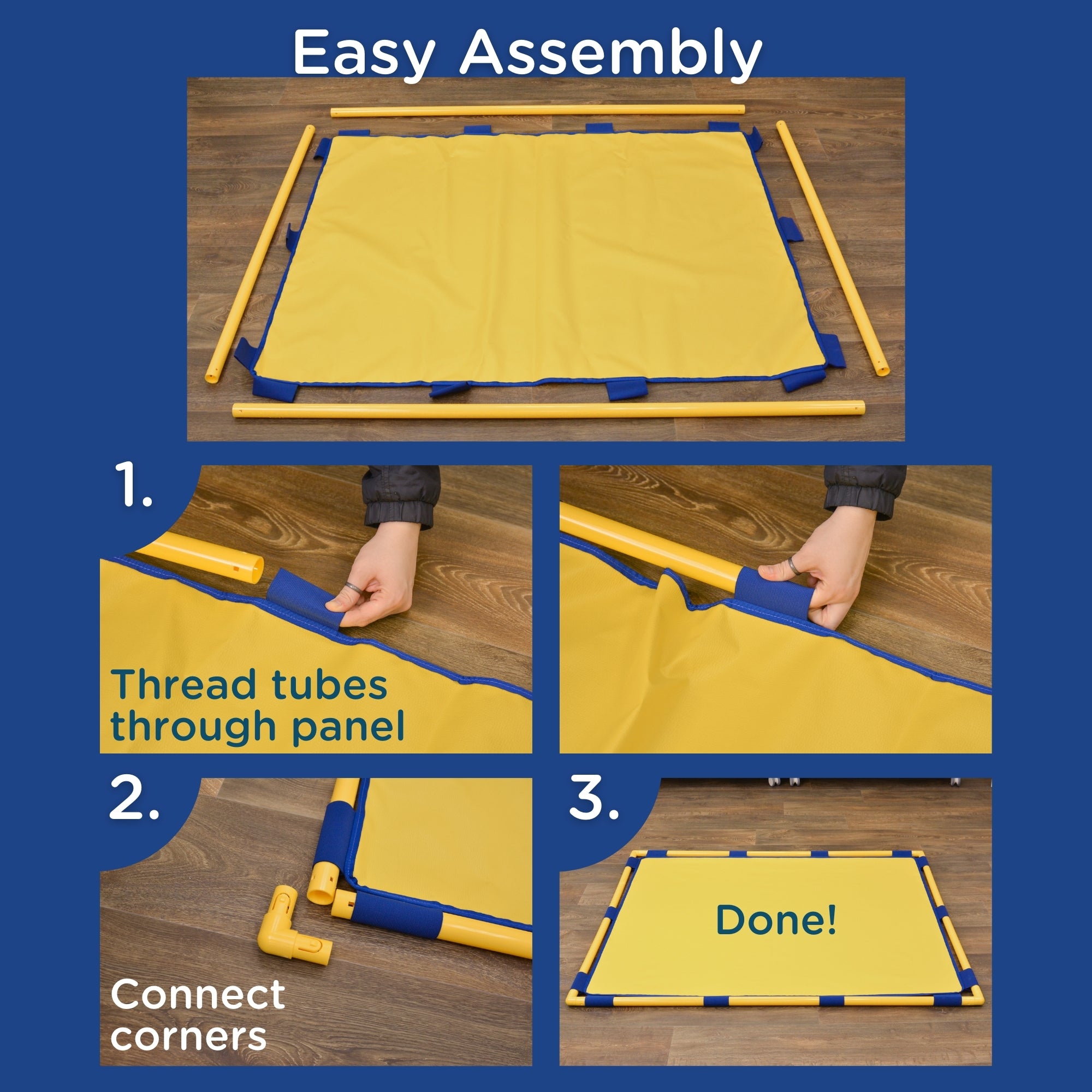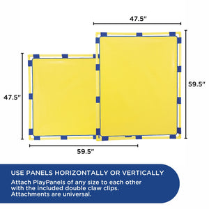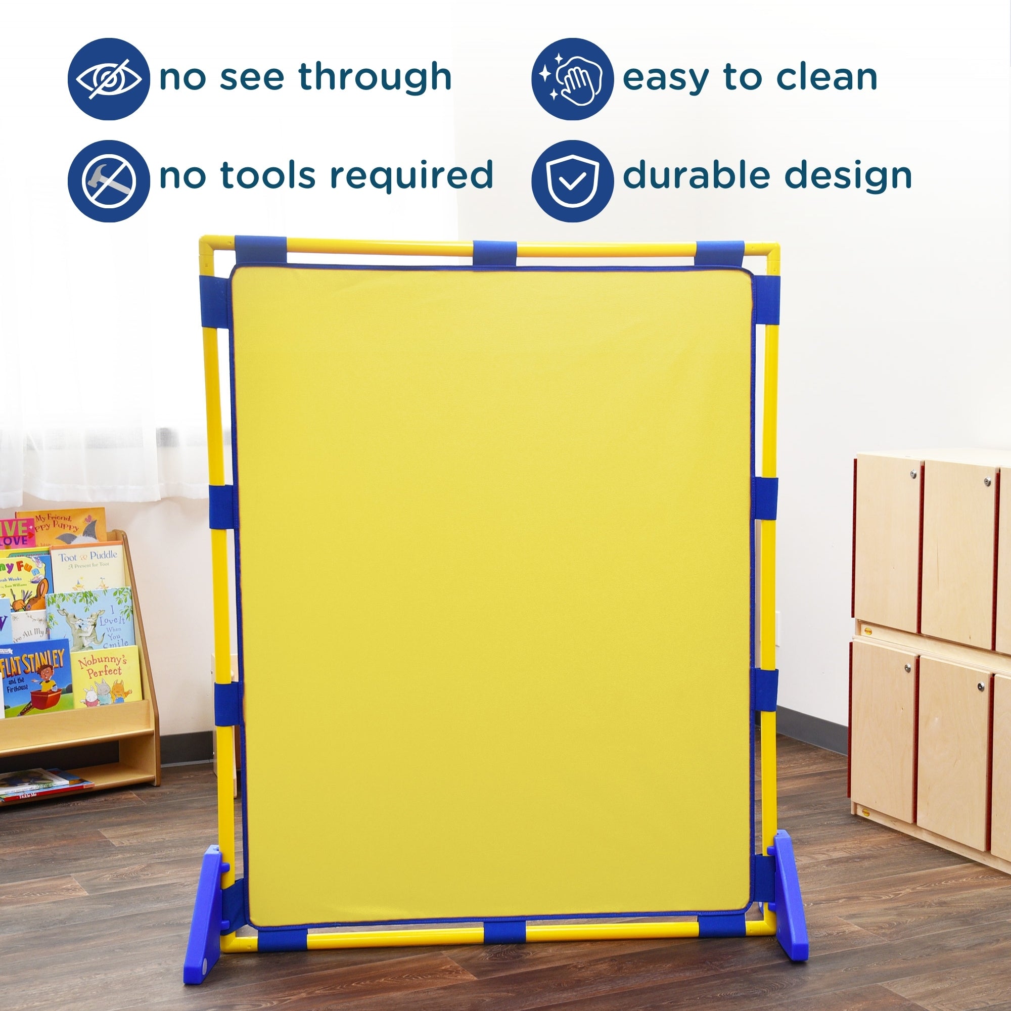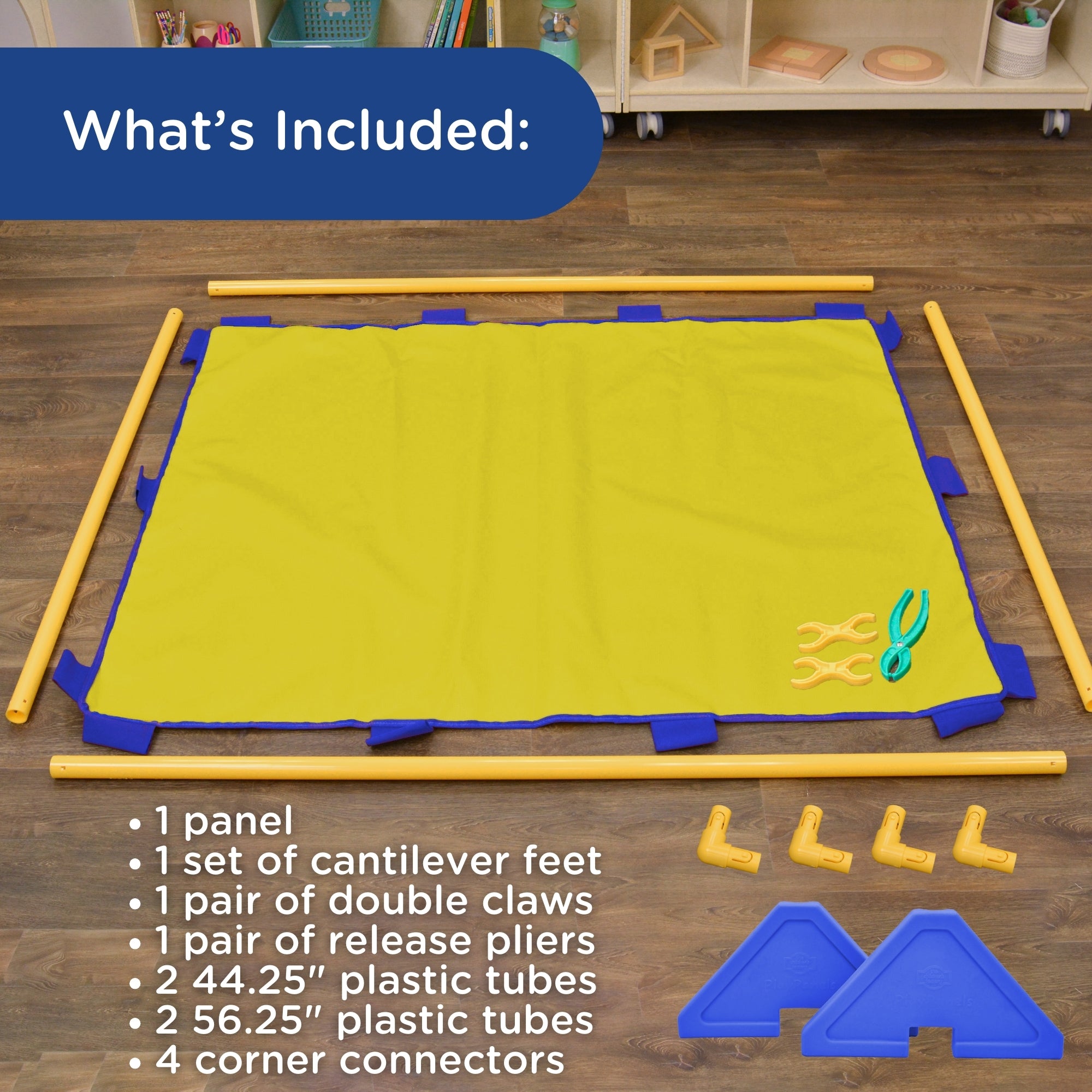 Customize your kids' learning space with the PlayPanel Room Dividers. Room dividing panels serve a variety of purposes such as separating activities or creating different work stations in your classroom. Using dividers encourages children to focus on the lesson or activity at hand without distractions. Each panel easily attaches to another with double claw clips. One set of double claw clips included. The easy to clean vinyl surface is stretched over durable, plastic, pipe frame. Weighted, cantilever legs connect to our PlayPanels to make them free-standing, stable room partitions. One pair of PlayPanel legs included.