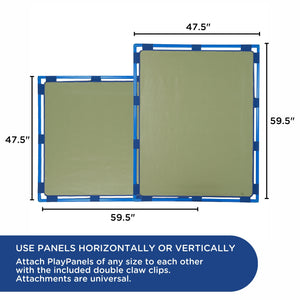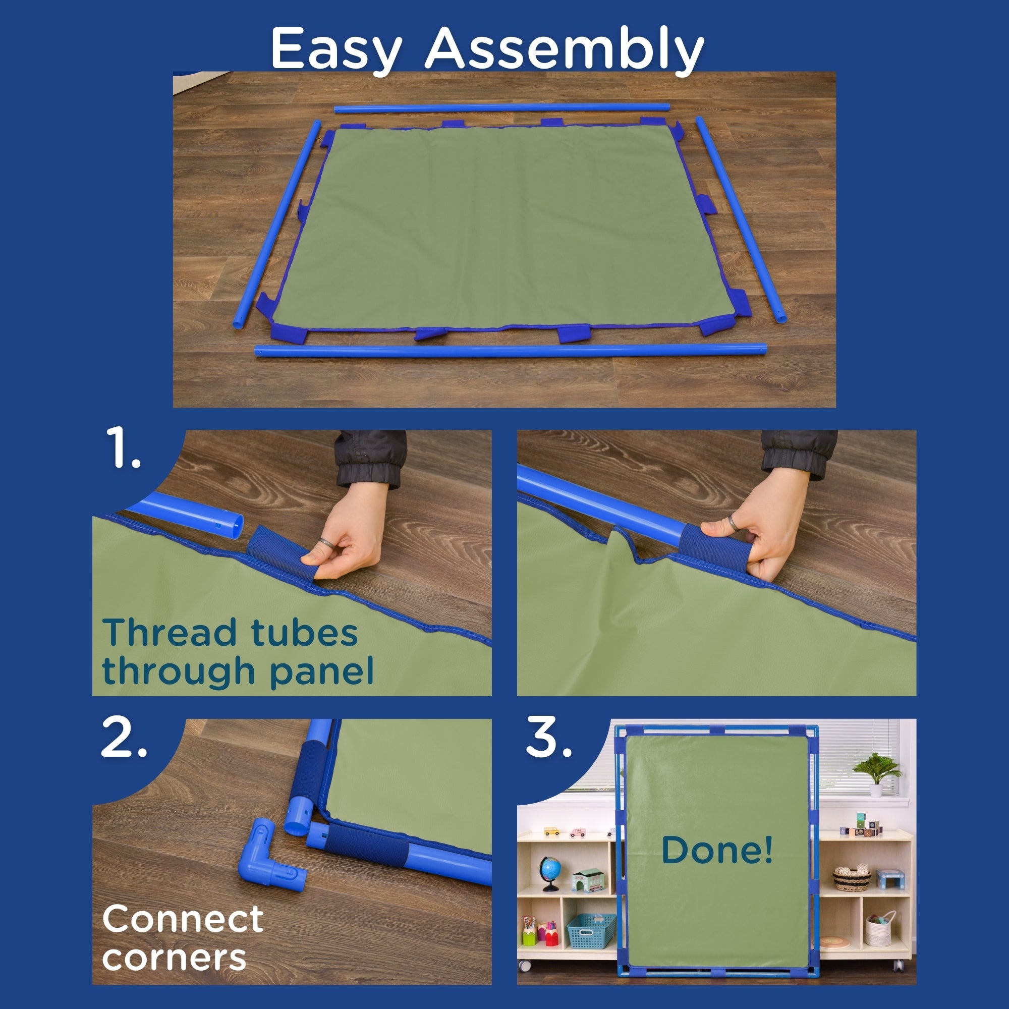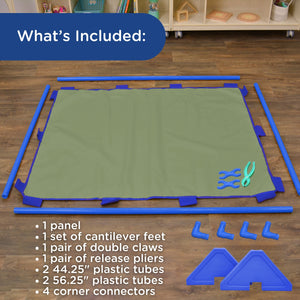 Customize your kids' learning space with the PlayPanel Room Dividers. Room dividing panels serve a variety of purposes such as separating activities or creating different work stations in your classroom. Using dividers encourages children to focus on the lesson or activity at hand without distractions. Each panel easily attaches to another with double claw clips. One set of double claw clips included. The easy to clean vinyl surface is stretched over durable, plastic, pipe frame. Weighted, cantilever legs connect to our PlayPanels to make them free-standing, stable room partitions. One pair of PlayPanel legs included.