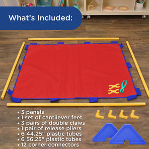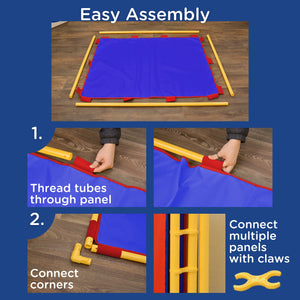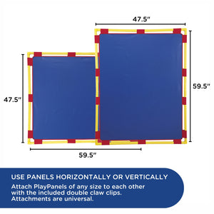 Customize your kids' learning space with the PlayPanel Room Dividers. Room dividing panels serve a variety of purposes such as separating activities or creating different work stations in your classroom. Using dividers encourages children to focus on the lesson or activity at hand without distractions. Each panel easily attaches to another with double claw clips. Three sets of double claw clips included. The easy to clean vinyl surface is stretched over durable, plastic, pipe frame. Weighted, cantilever legs connect to our PlayPanels to make them free-standing, stable room partitions. One pair of PlayPanel legs included.