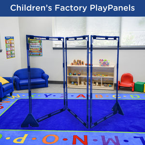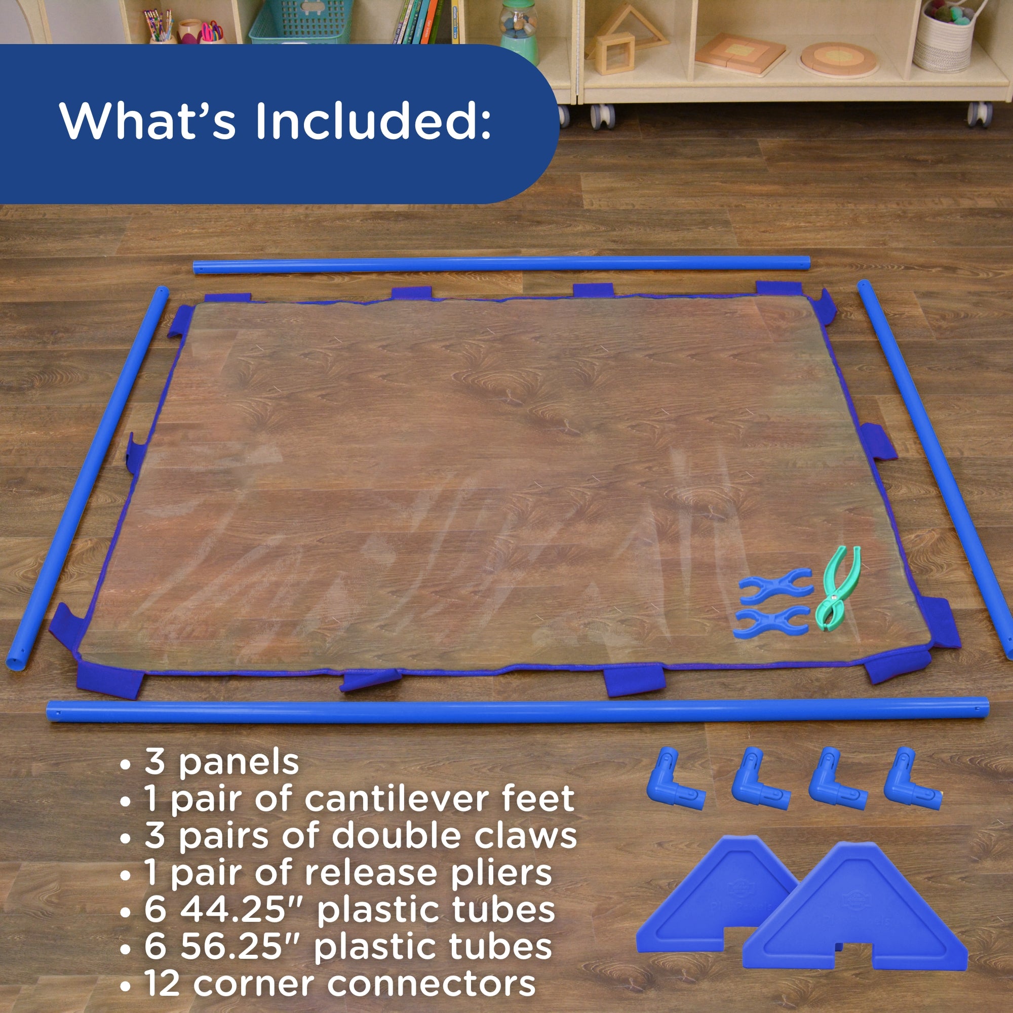 Customize your kids' learning space with the PlayPanel Room Dividers. Room dividing panels serve a variety of purposes such as separating activities or creating different work stations in your classroom. Using dividers encourages children to focus on the lesson or activity at hand without distractions. Each panel easily attaches to another with double claw clips. Three sets of double claw clips included. The easy to clean vinyl surface is stretched over durable, plastic, pipe frame. Weighted, cantilever legs connect to our PlayPanels to make them free-standing, stable room partitions. One pair of PlayPanel legs included.