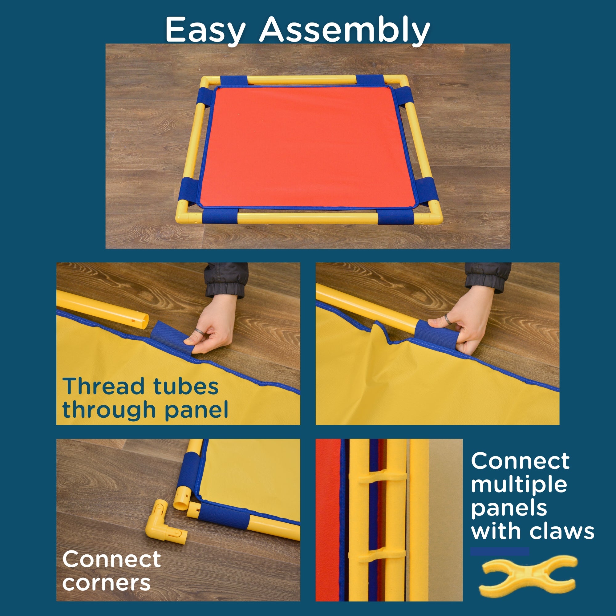 Customize your kids' learning space with the PlayPanel Room Dividers. Room dividing panels serve a variety of purposes such as separating activities or creating different work stations in your classroom. Using dividers encourages children to focus on the lesson or activity at hand without distractions. Each panel easily attaches to another with double claw clips. Three sets of double claw clips included. The easy to clean vinyl surface is stretched over durable, plastic, pipe frame. Weighted, cantilever legs connect to our PlayPanels to make them free-standing, stable room partitions. Two PlayPanel legs included.