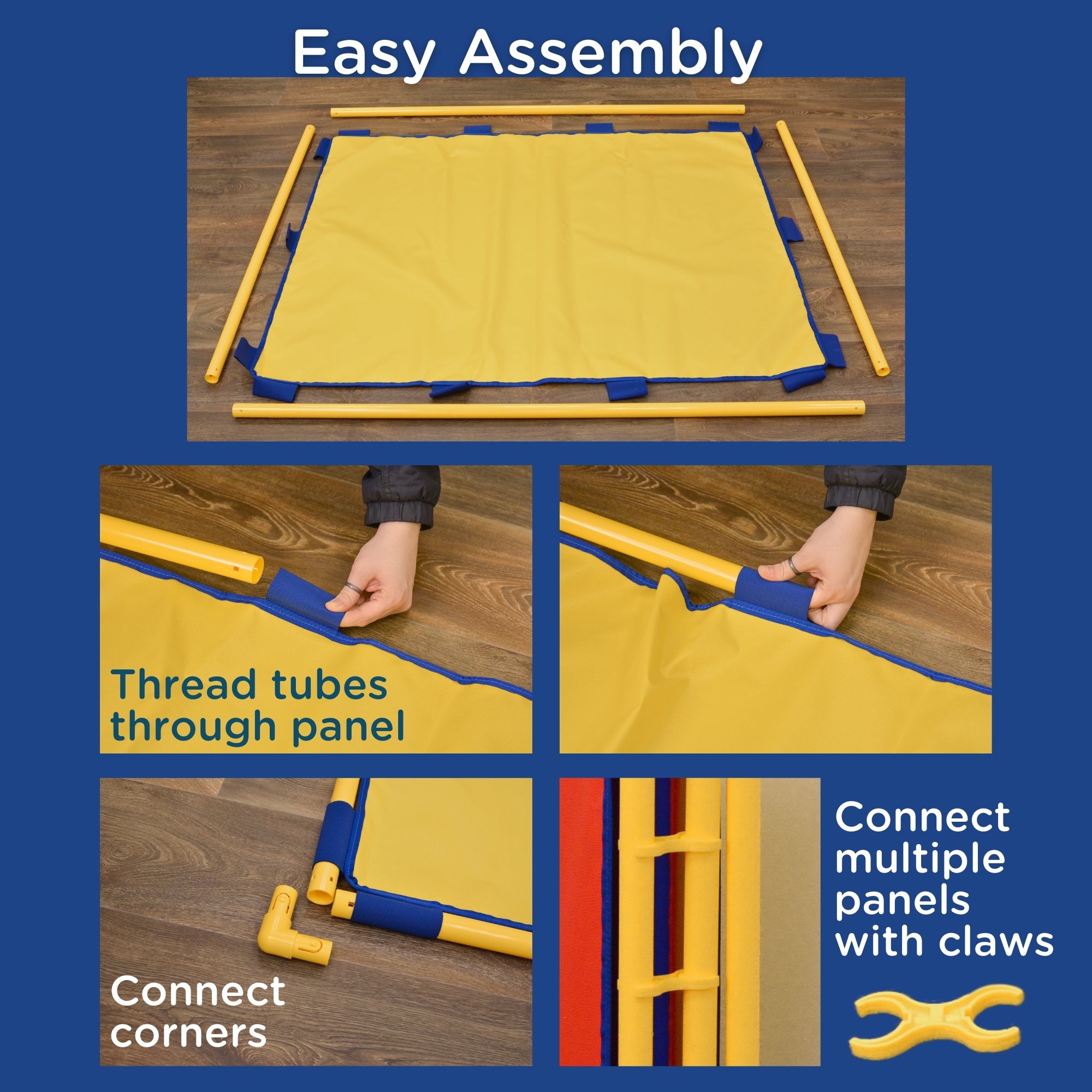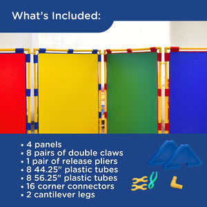 Use this set of 4 easily portable Big Screens either vertically or horizontally to screen off separate areas. Hygienic cleanable vinyl-covered nylon surfaces stretched upon polystyrene durable fittings. Flexible hinges link together and allow for foldable storage. Molded, weighted plastic Cantilever Legs ensure stability.