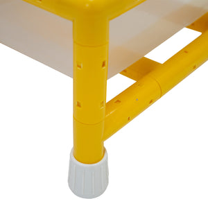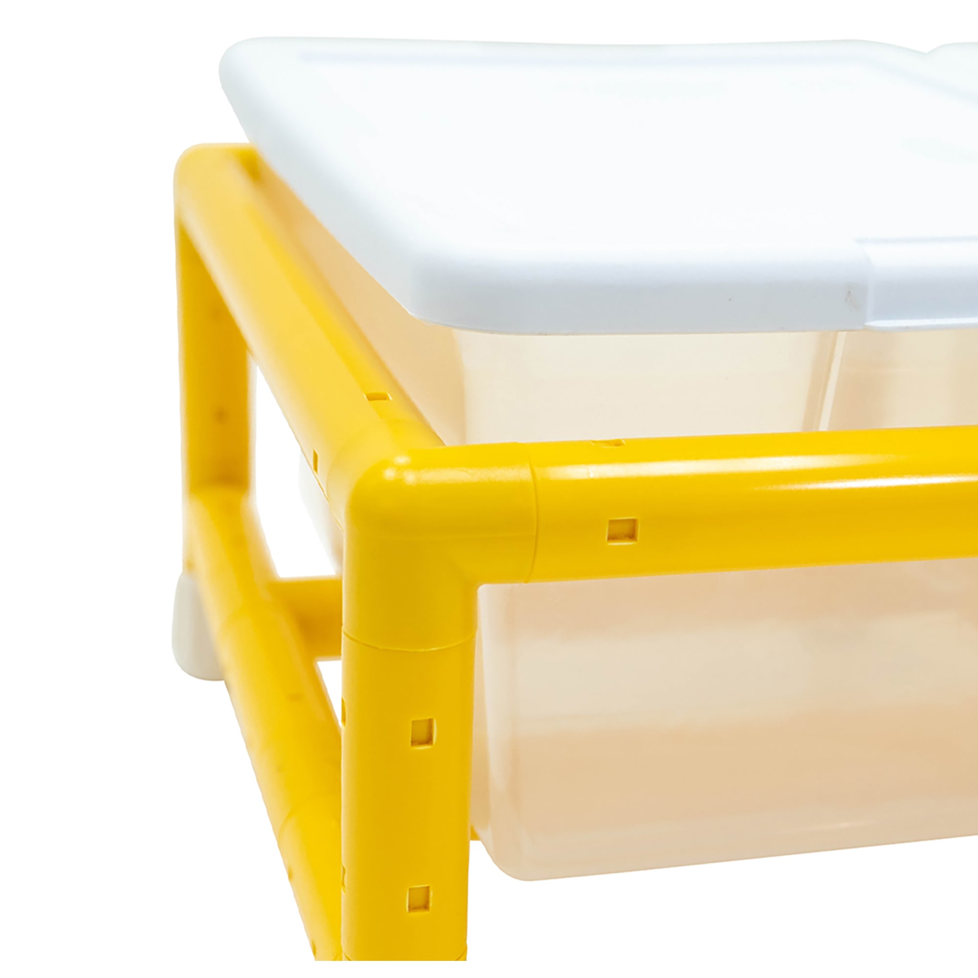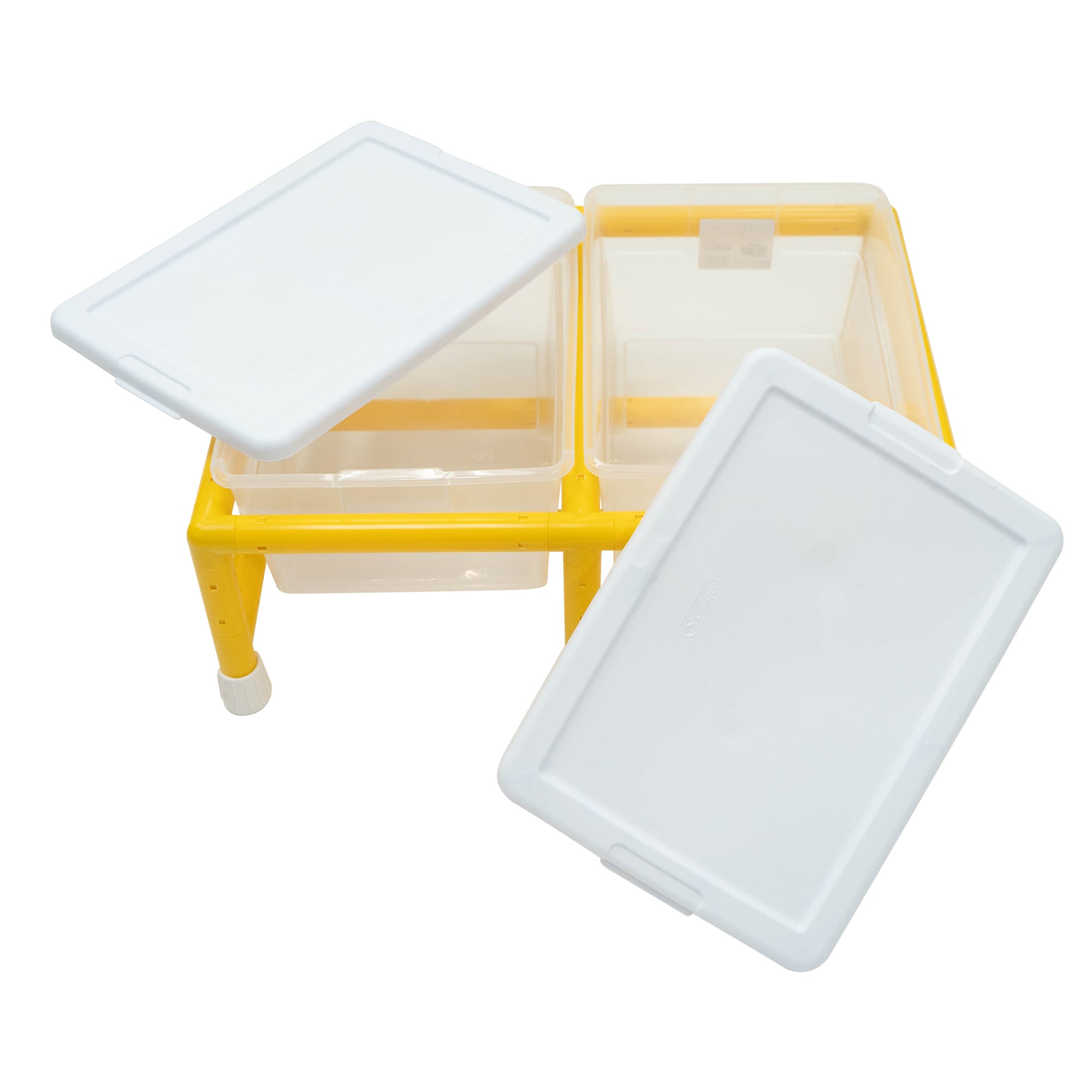 Sand & Water Tables, Each tub is 16"l x 11-1/2"w x 6-3/4"h with its own snap on lid. Easy assembly (no tools required) with anti-slip heavy duty rubber floor protectors. All parts are non-rust snap together ABS plastic. Two heights available (20" and 24"). These can also be used for book storage.