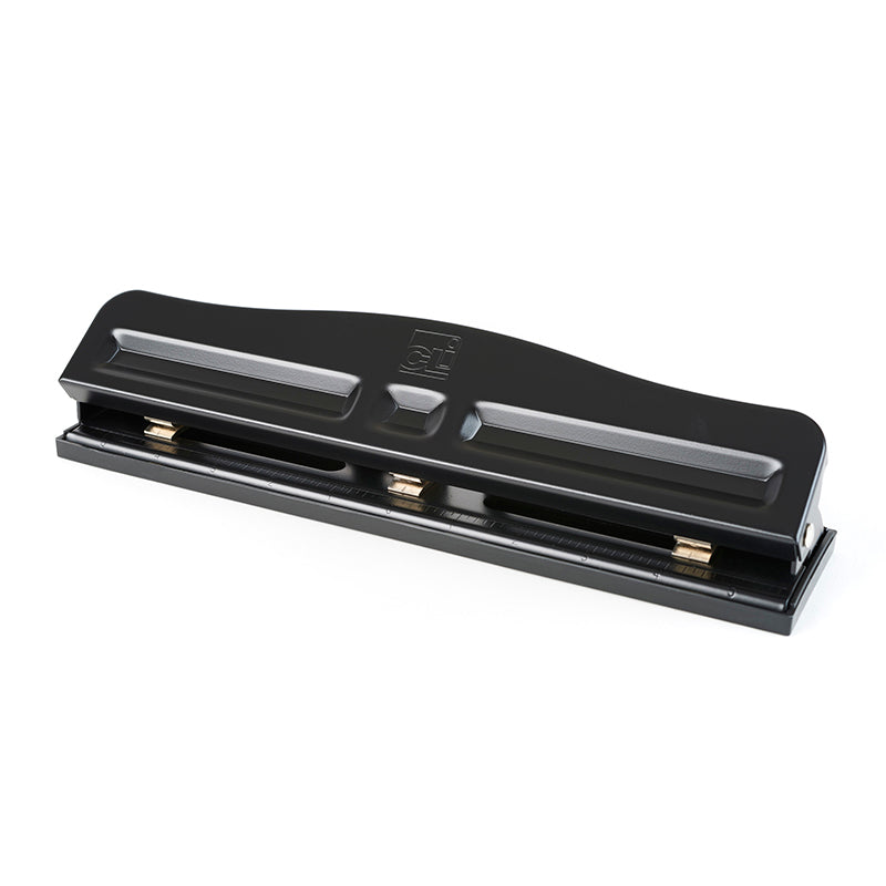 Three-hole model features black enamel finish, non-skid base, removable chip trap and accurate built-in centering guides. Three-hole adjustable model is fully adjustable and converts to a two-hole punch with built-in neutralizing center head. Punches up to 12 sheets of 16 lb. paper. 9/32" hole Diameter.
