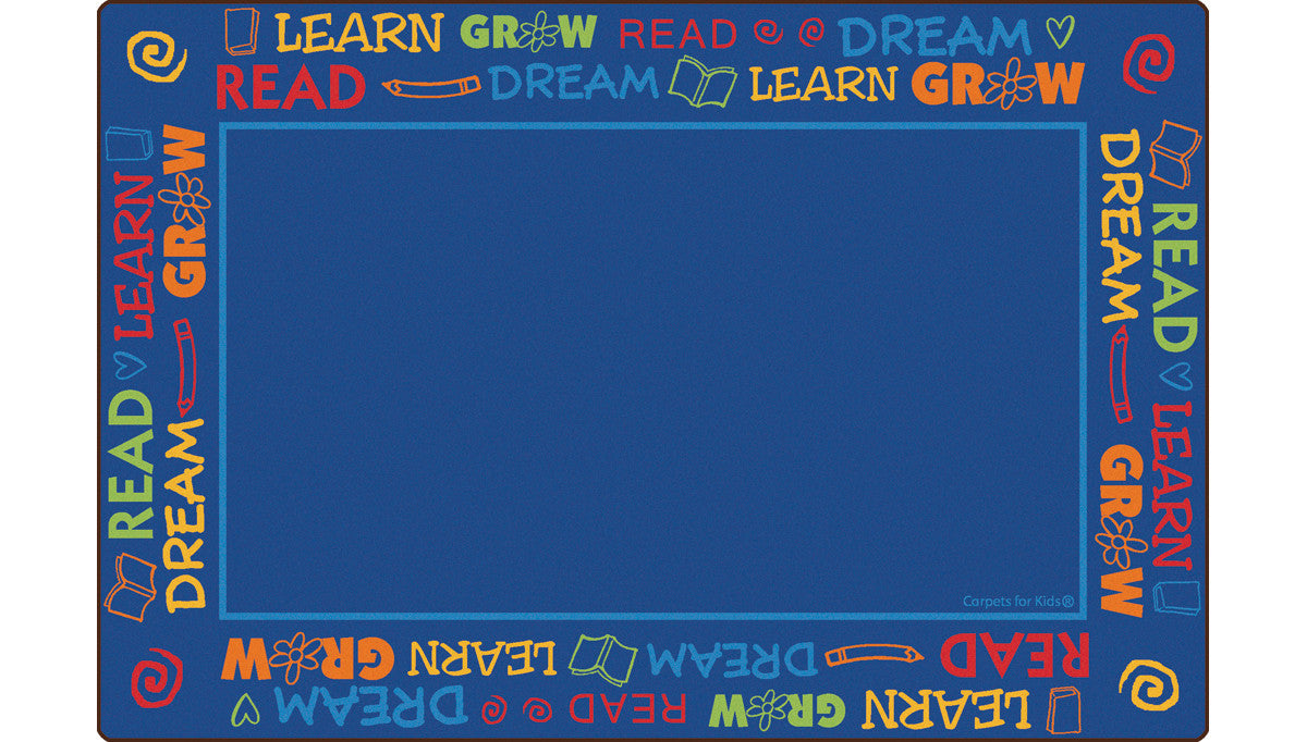 Bordered by the words Learn Read Dream Grow, this rug provides a great place for gathering and reading in any childhood setting.