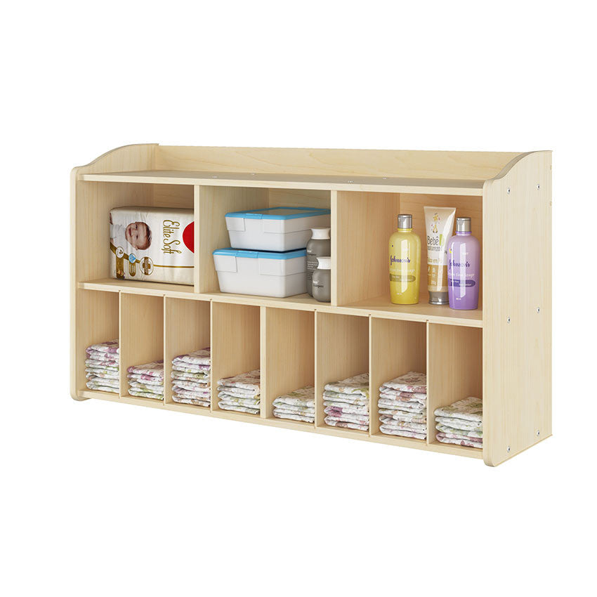 Wall unit features one large shelf and eight small (4.6"W x 10"H) storage compartments perfect for additional baby supplies. The Maple laminate construction makes this unit easy to clean. Diaper organizer arrive ready to assemble. Overall Dimensions are 45" L x 13.25" W x 25.25" H See # 18528 for the matching Changing Table.