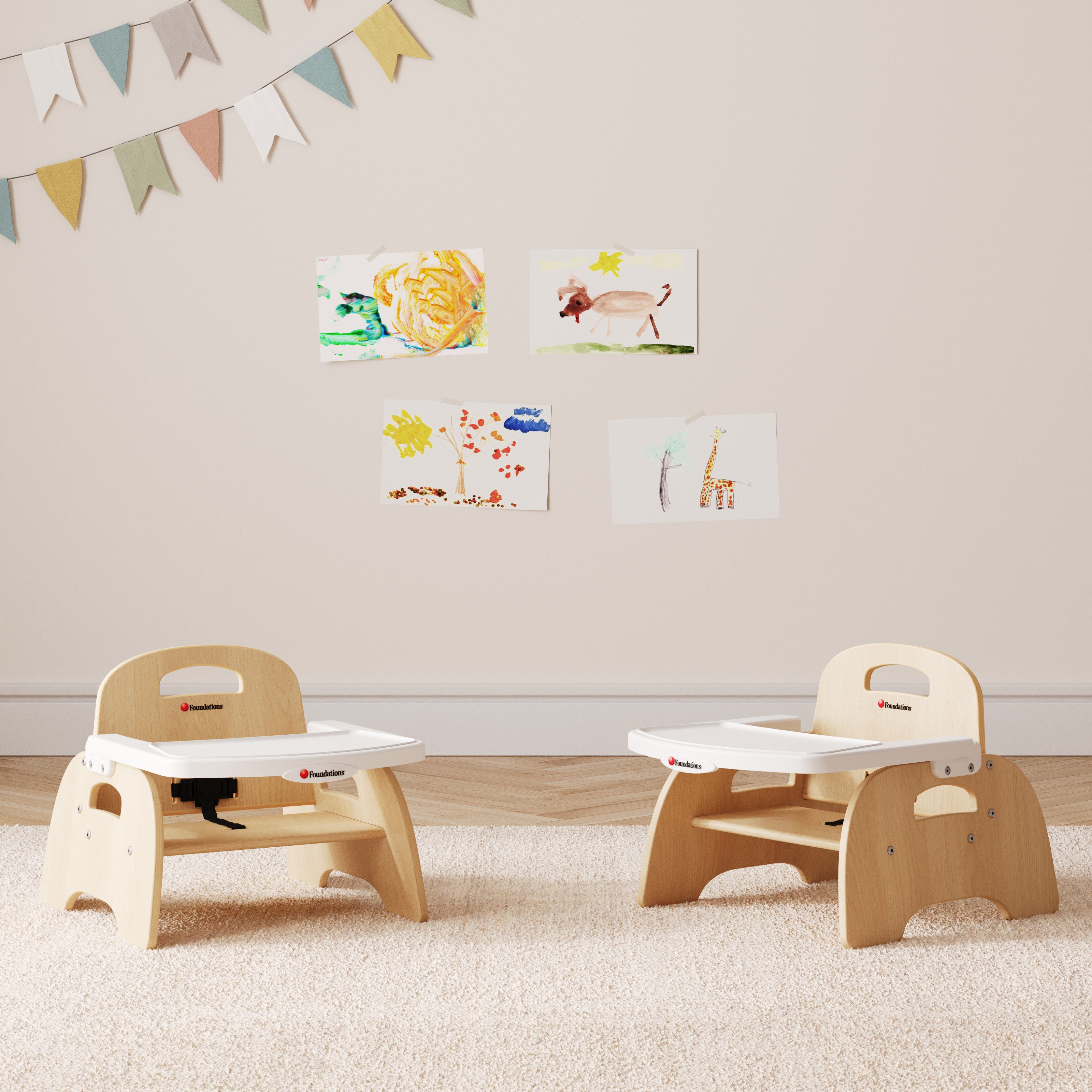The Easy Serve™ Feeding Chair with adjustable harness features a removable EasyClean™ tray that adjusts to three locations for a perfect fit. Sold in packs of two, this child care feeding chair is available in five popular seat heights that allow children to self-load with minimal assistance and comfortably rest their feet on the ground. The wide, no-tip base keeps the child stable and secure on the floor. This easy-to-clean Baltic Birth plywood chair with a food-service grade finish features a removable tray insert for convenient meal-prep. Recommended weight below 40 lbs.