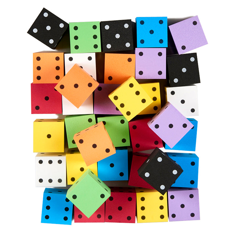 Ideal for games and practicing math skills, these soft foam dice are much quieter than regular dice. There are hundreds of counting, sorting and math applications! Includes 36 assorted color, 2", spot foam dice.