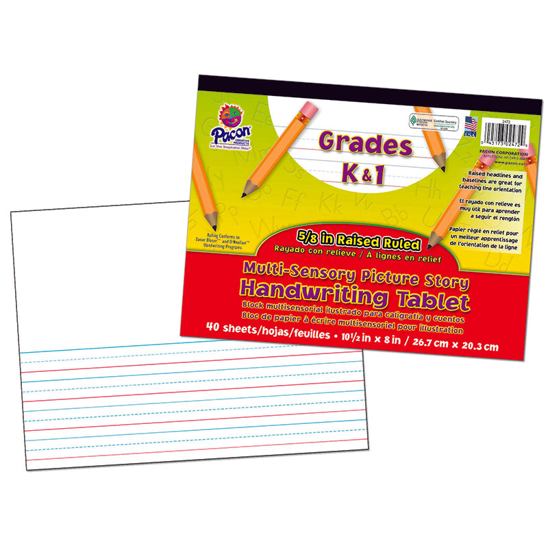 The Multi-Sensory Raised Ruled Paper has raised headlines and baselines which help students stay within the guidelines. It helps teach handwriting through two senses, sight and touch. The headlines are blue and the baselines are red. It has a 5/8? ruling, 5/16? dotted midline and 5/16? skip space and conforms to both D'Nealian™ and Zaner-Bloser™ handwriting styles. #2472 has 4-3/8? picture story space. Tablets contain 40 sheets with a heavy chipboard back and protective retail-friendly front cover.